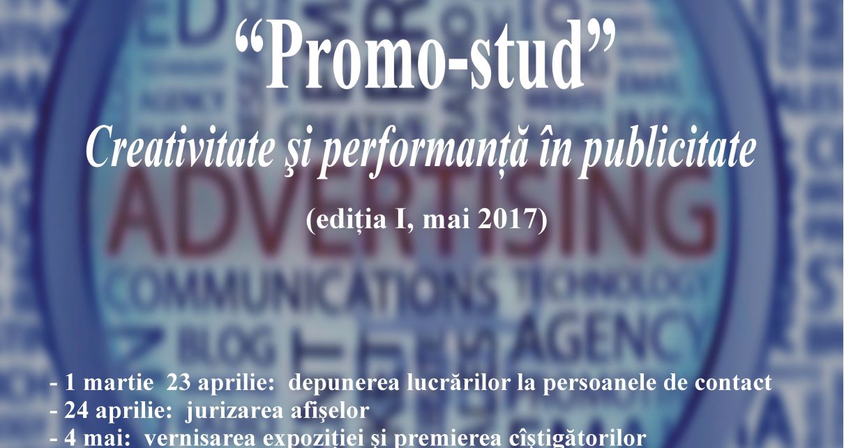 Facultatea de Litere şi Ştiinţe ale Comunicării din cadrul Universităţii “Ştefan cel Mare” Suceava, cu aportul nemijlocit al specializării Comunicare şi Relaţii Publice, organizează, în perioada 1 martie – 4 mai 2017, prima ediție a concursului de afiş publicitar “Promo-stud”, cu tema Creativitate şi performanţă în publicitate. Obiectivul competiției este încurajarea tinerelor talente şi dezvoltarea