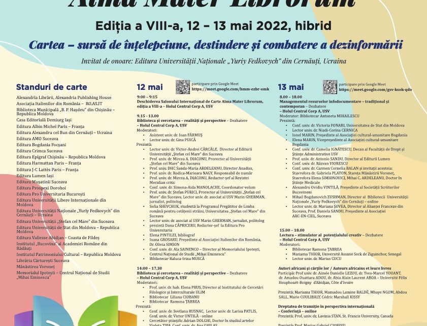 Biblioteca Universităţii „Ştefan cel Mare” din Suceava, în parteneriat cu Centrul de Reuşită Universitară şi Alianţa Franceză din Suceava, sub egida Ministerului Educaţiei, organizează, în perioada 12-13 mai 2022, cea de-a VIII-a ediţie a Salonului Internaţional de Carte Alma Mater Librorum, în format hibrid. Salonul de carte se bucură, la această nouă ediţie, de o
