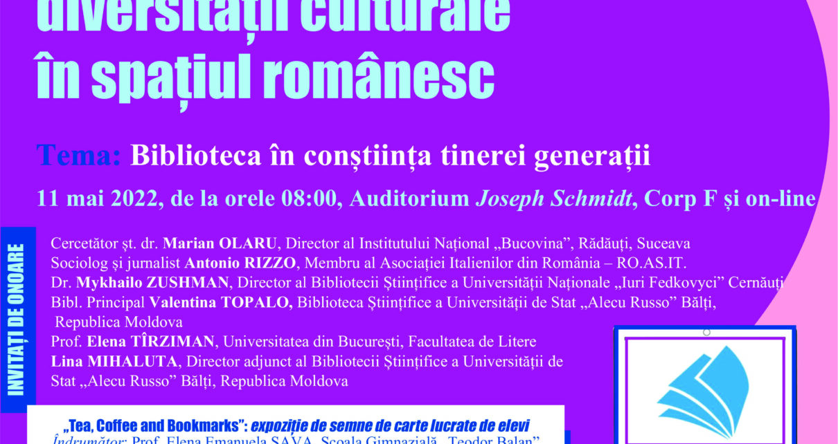 Biblioteca Universității „Ștefan cel Mare” din Suceava, în colaborare cu Asociaţia Bibliotecarilor din România – A.B.R., Asociaţia Italienilor din România – RO.AS.IT., Casa Corpului Didactic „George Tofan” și Inspectoratul Școlar Județean din Suceava, organizează, în data de 11 mai 2022, cea de-a VI-a ediţie a Simpozionului național cu participare internațională CONTRIBUȚIA BIBLIOTECII LA AFIRMAREA DIVERSITĂȚII