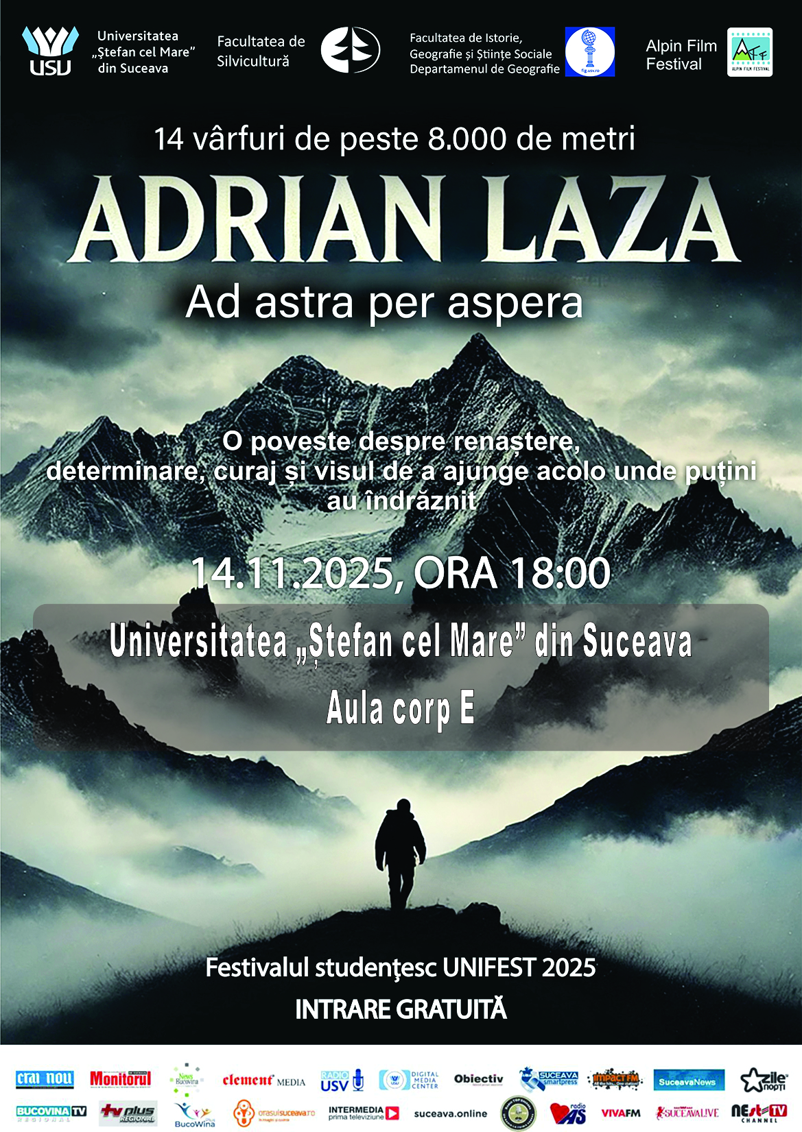În cadrul acestui amplu proiect, Suceava va fi una dintre destinațiile speciale ale caravanei, găzduind proiecția documentarului „Adrian Laza – 14 vârfuri de peste 8.000 m”, un film impresionant despre renaștere, curaj, teamă și solidaritate, o poveste despre depășirea limitelor și forța interioară a omului care a ales să urce acolo unde puțini au îndrăznit.