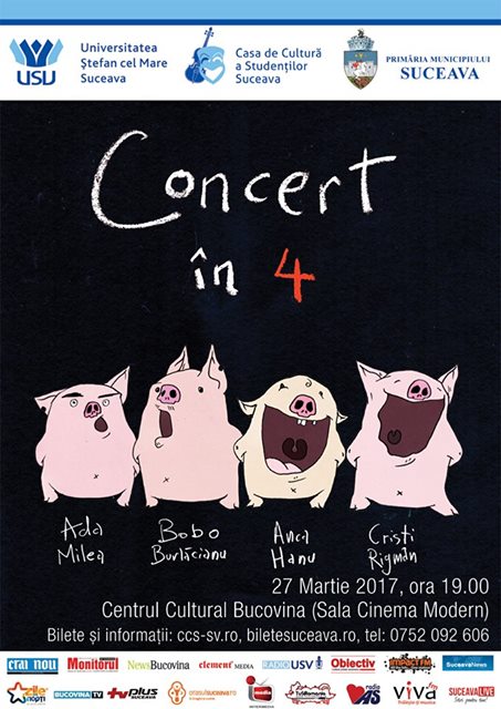 Casa de Cultură a Studenţilor Suceava vă invită la un „Concert în 4”, susținut de Ada MILEA, Bobo BURLĂCIANU, Anca HANU și Cristi RIGMAN.