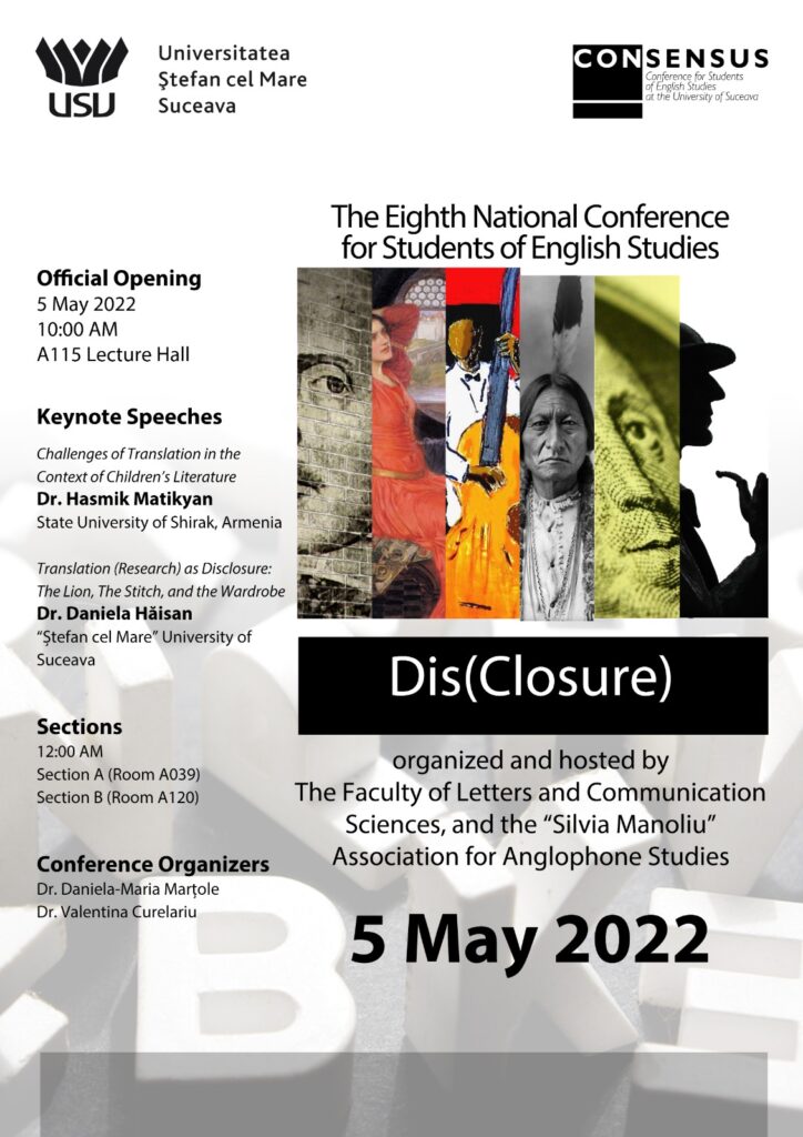 Colectivul de limba engleză al Facultății de Litere și Științe ale Comunicării, în colaborare cu Asociaţia de Studii Anglofone „Silvia Manoliu”, a organizat joi, 5 mai a.c., cea de-a VIII-a ediție a conferinței CONSENSUS, adresată studenților de la specializări cu limba engleză, la nivel de licență, masterat și doctorat.