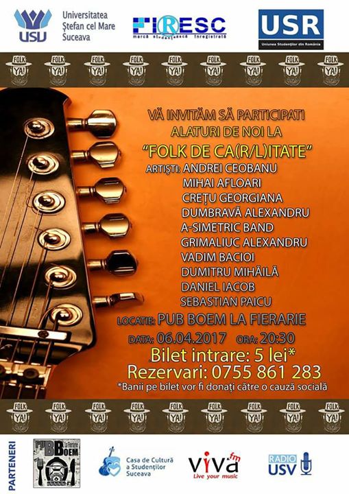 Pe data de 6.04.2017, ora 20:30, va avea loc la PUB BOEM Fierarie o seară de “Folk de ca(r/l)itate” alături de oameni faini, muzică bună și distracție pe măsură. Banii pe bilete, cât și donațiile voastre vor merge către un caz social. (Zolpidem) Pentru mai multe detalii, cât și rezervări, sunați la numarul de telefon 0755 861 283 și puteți asculta și un interviu despre acest eveniment mai jos: