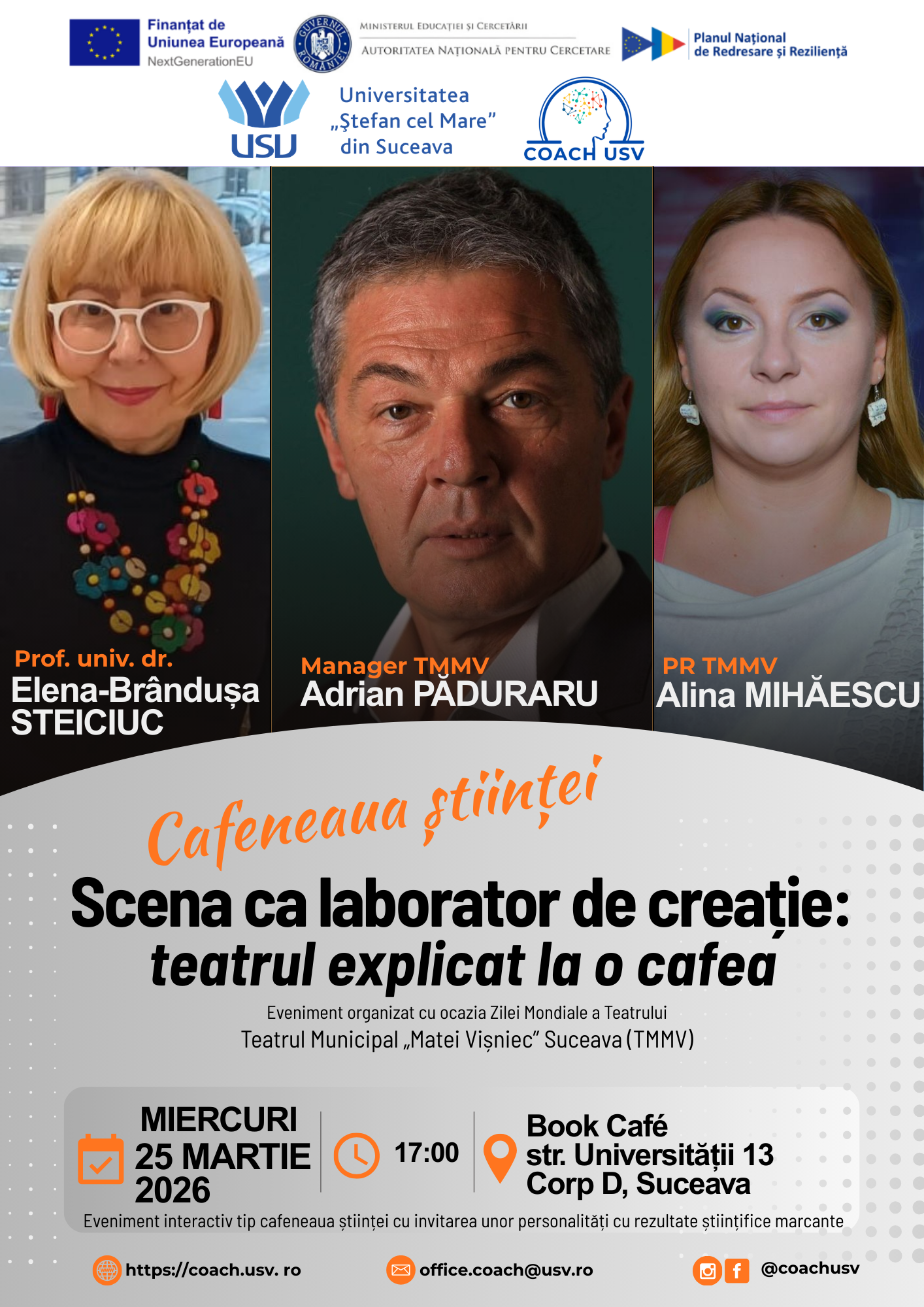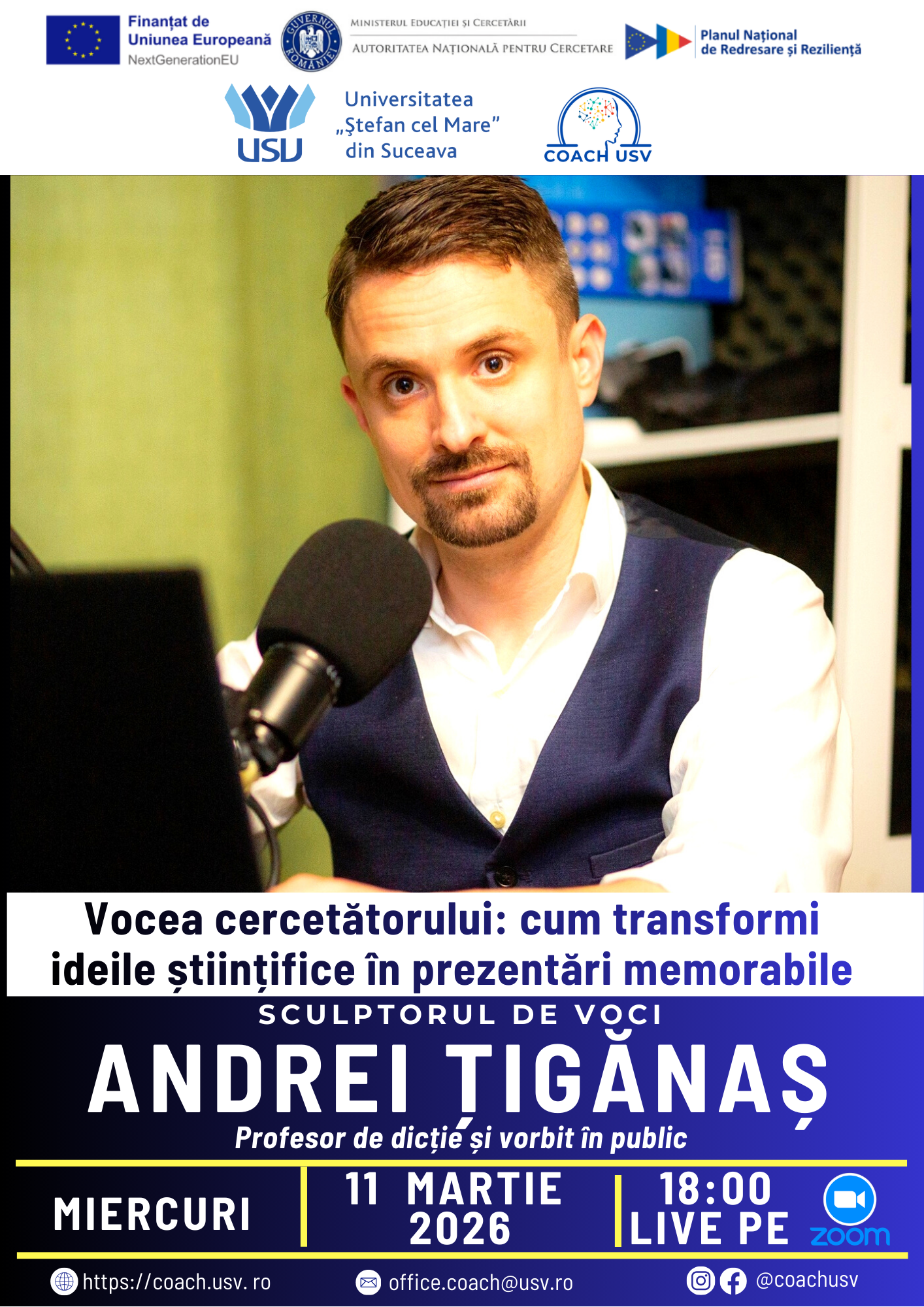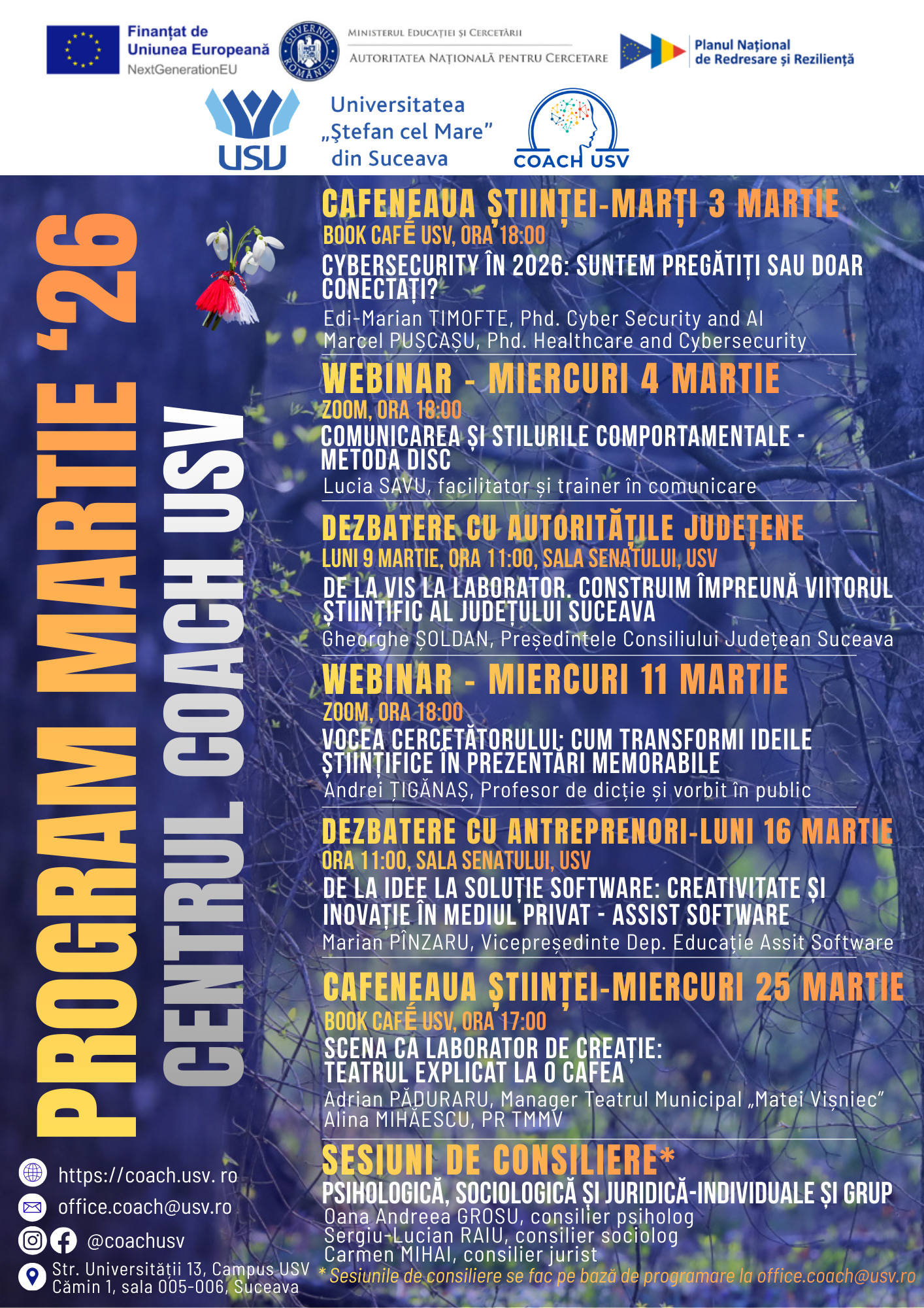 Centrul COACH USV a organizat mai multe activități în luna MARTIE 2026, dedicate dezvoltării personale și profesionale a studenților, doctoranzilor, cercetătorilor și cadrelor didactice, din Regiunea de NE a României.
