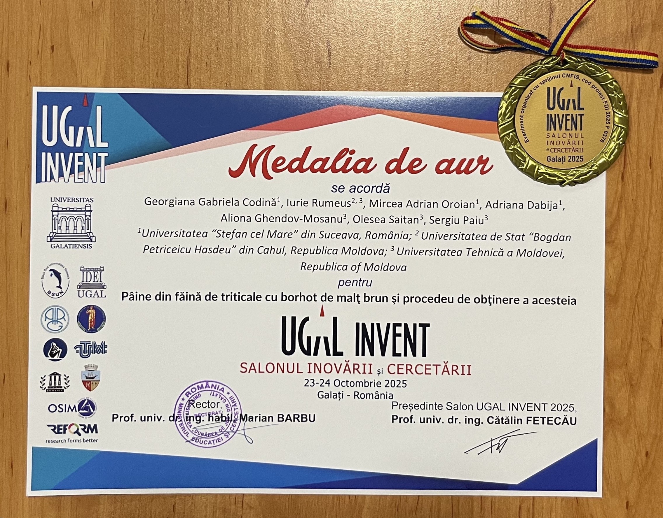 Facultatea de Inginerie Alimentară din cadrul Universității „Ștefan cel Mare” din Suceava, în parteneriat cu Universitatea Tehnică a Moldovei, a fost distinsă cu două medalii de aur la Salonul Inovării și Cercetării UGAL INVENT 2025, care s-a desfășurat între 23 și 24 octombrie a.c., la Universitatea „Dunărea de Jos” din Galați.