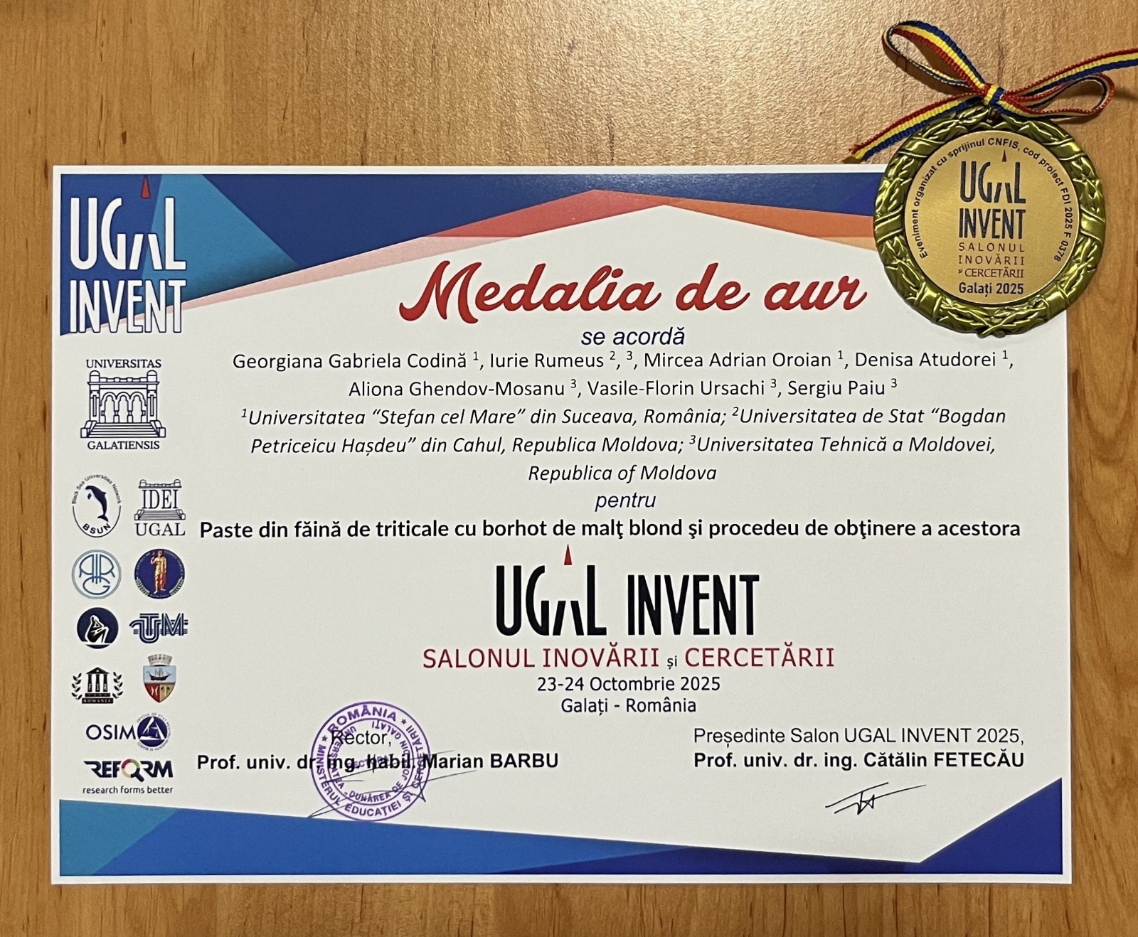 Facultatea de Inginerie Alimentară din cadrul Universității „Ștefan cel Mare” din Suceava, în parteneriat cu Universitatea Tehnică a Moldovei, a fost distinsă cu două medalii de aur la Salonul Inovării și Cercetării UGAL INVENT 2025, care s-a desfășurat între 23 și 24 octombrie a.c., la Universitatea „Dunărea de Jos” din Galați.