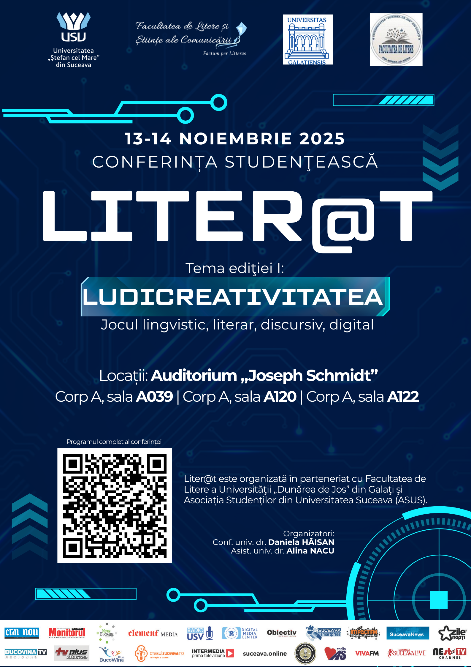 Intitulată LUDICREATIVITATEA (Jocul lingvistic, literar, discursiv, digital), conferința a atras peste o sută de studenți din domeniile Filologie, Comunicare şi relaţii publice, Media digitală și Jurnalism din șase centre universitare (Universitatea „Dunărea de Jos” din Galaţi, Universitatea din Bucureşti, Universitatea „Alexandru Ioan Cuza” din Iaşi, Universitatea „Babeş-Bolyai” din Cluj-Napoca, Universitatea de Medicină, Farmacie, Ştiinţe şi Tehnologie „George Emil Palade” din Târgu Mureş și Universitatea „Ştefan cel Mare” din Suceava), care vor prezenta lucrări în limbile română, engleză, franceză, spaniolă și italiană.