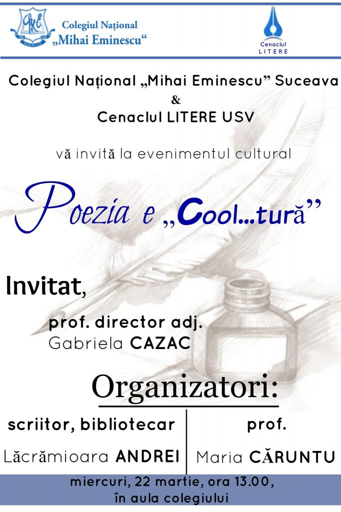Miercuri, 22 martie, Colegiul Naţional „Mihai Eminescu” Suceava, în parteneriat cu Cenaclul Litere USV, organizează activitatea intitulată „Poezia e cool…tură”, dedicată Zilei Internaţionale a Poeziei. Evenimentul se adresează în special tinerilor şi are ca obiective crearea unui dialog poetic între generaţii şi promovarea poeziei în rândul tinerilor.