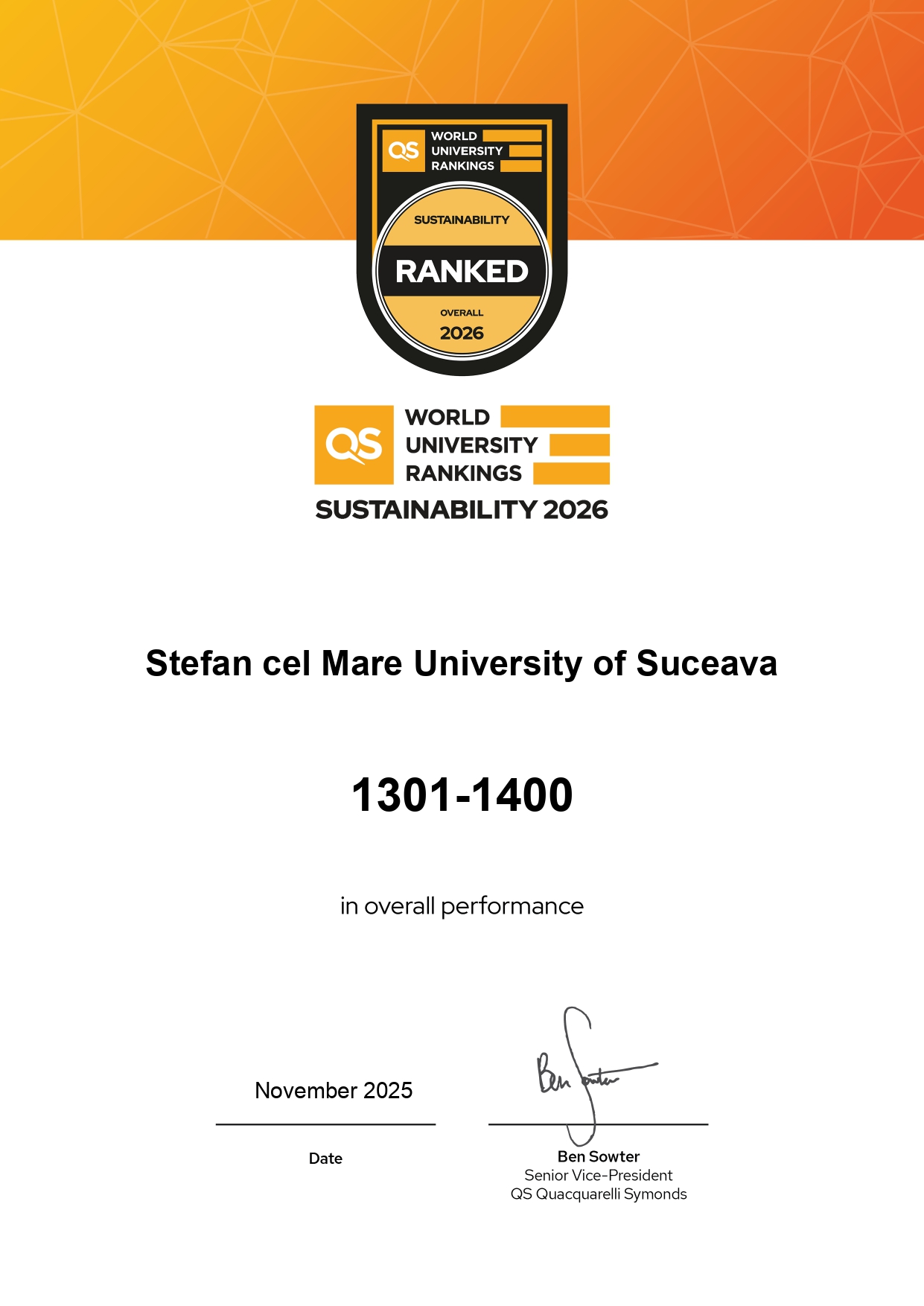 Astăzi, 18 noiembrie, a fost publicată ediția 2026 a QS World University Rankings: Sustainability. Acest clasament internațional, realizat de Quacquarelli Symonds, evaluează modul în care universitățile adoptă și implementează măsuri pentru a gestiona provocările actuale la nivel global. În această nouă ediție a clasamentului, Universitatea „Ștefan cel Mare” din Suceava (USV) se situează în intervalul 1301-1400 la nivel mondial și se menține pe poziția 7 la nivel național, consolidându-și angajamentul față de dezvoltarea durabilă. Poziționarea USV reafirmă misiunea universității de a intensifica implementarea de politici și strategii orientate spre sustenabilitate și de a valorifica schimburile de bune practici din cadrul alianțelor universitare europene și naționale, pentru a contribui, astfel, la atingerea obiectivelor globale stabilite de ONU.