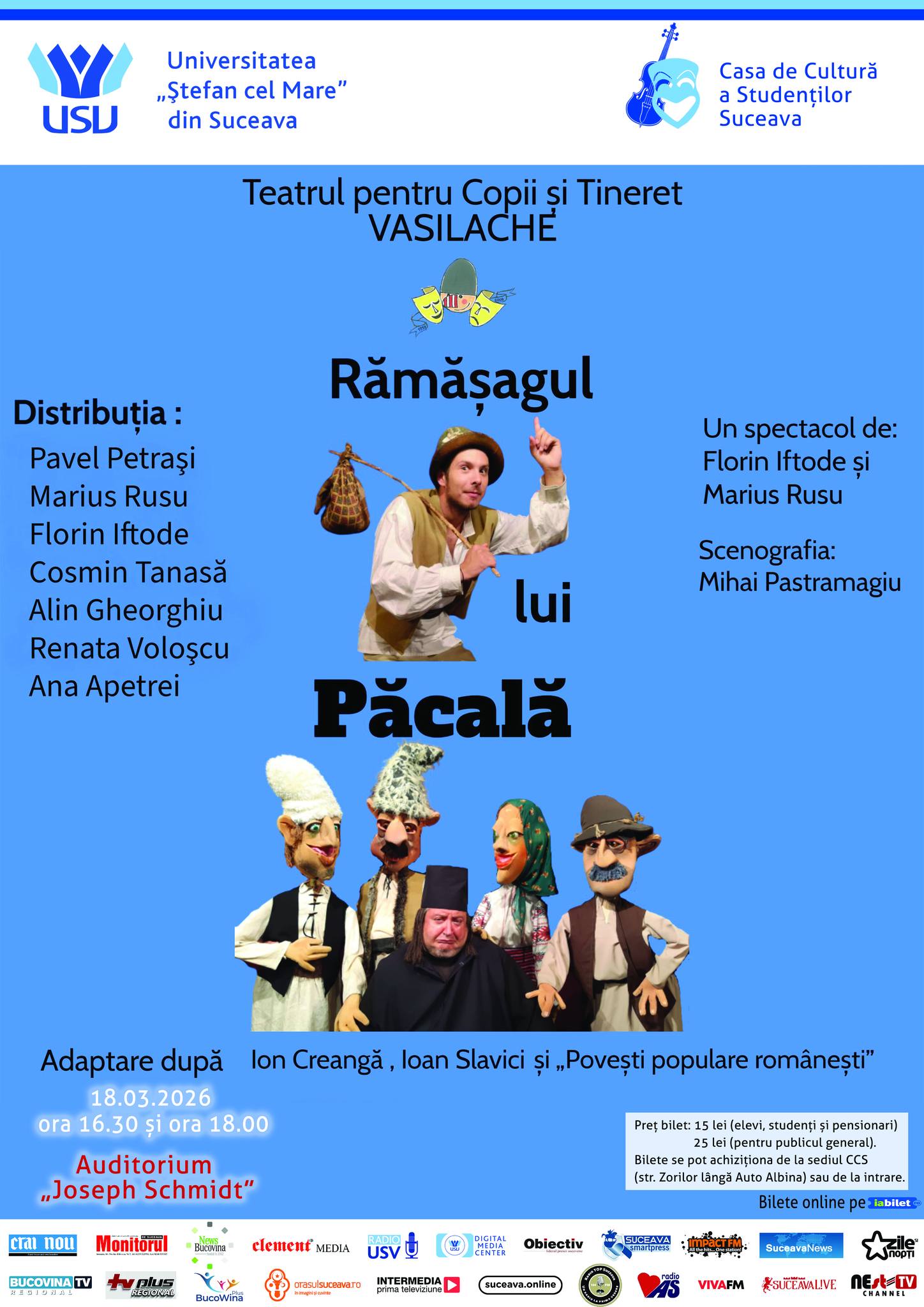 Casa de Cultură a Studenților din Suceava invită publicul la spectacolul „Rămăşagul lui Păcală”, o comedie plină de vervă și înțelepciune populară, semnată de Florin Iftode și Marius Rusu, după texte de Ion Creangă, Ioan Slavici și din povești populare românești. Regia artistică poartă semnătura autorilor, iar scenografia este realizată de Mihai Pastramagiu.