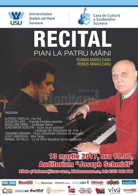 Casa de Cultură a Studenţilor din cadrul Universităţii „Ștefan cel Mare” Suceava organizează un recital de pian la patru mâini susţinut de Remus Manoleanu şi Roman Manoleanu.