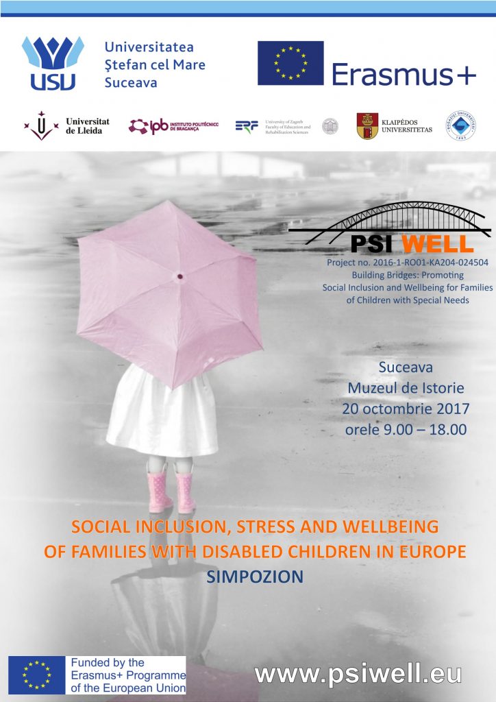 Facultatea de Ştiinţe ale Educaţiei din cadrul Universităţii „Ştefan cel Mare” din Suceava organizează un eveniment de multiplicare în cadrul Proiectului Erasmus+, KA2 – Cooperation for Innovation and the Exchange of Good Practices Strategic Partnerships for adult education, 2016-1-RO01-KA204-024504 – BUILDING BRIDGES: PROMOTING SOCIAL INCLUSION AND WELLBEING FOR PARENTS OF CHILDREN WITH SPECIAL NEEDS – PSI_WELL, vineri, 20 octombrie 2017, începând ora 9.00, în sala de conferințe a Muzeului de Istorie a Bucovinei.