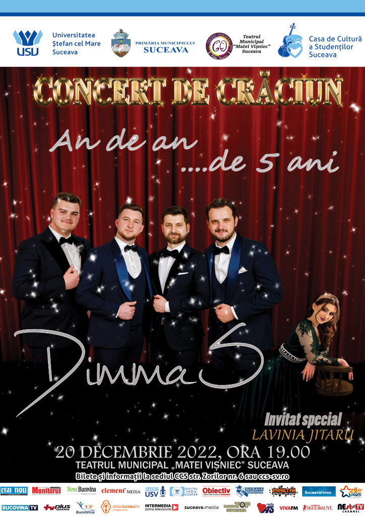 20 DECEMBRIE 2022 – Casa de Cultură a Studenților, în parteneriat cu Teatrul Municipal „Matei Vișniec” și Primăria Suceava, vă invită la un concert de Crăciun – „An de an… de 5 ani”, în compania cvartetului vocal de muzică pop-opera „DIMMA’S”, începând cu ora 19:00. Bilete și rezervări on-line sau la sediul Casei de Cultură a Studenților, de pe str. Zorilor, nr. 6. (Lângă Auto Albina)