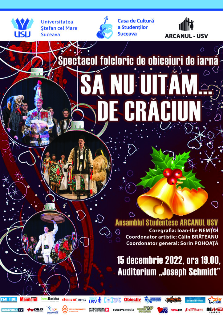 15 DECEMBRIE 2022 – spectacol cu datini și obiceiuri de Crăciun susținut de Ansamblul Artistic Studențesc Arcanul USV : „Vă așteptăm la spectacolul tradițional „Să nu uităm… de Crăciun”, începând cu ora 19.00. Sărbători fericite, tuturor! Intrarea este liberă”, a menționat coordonatorul ansamblului, prof.univ.dr.ing. Sorin Pohoață.