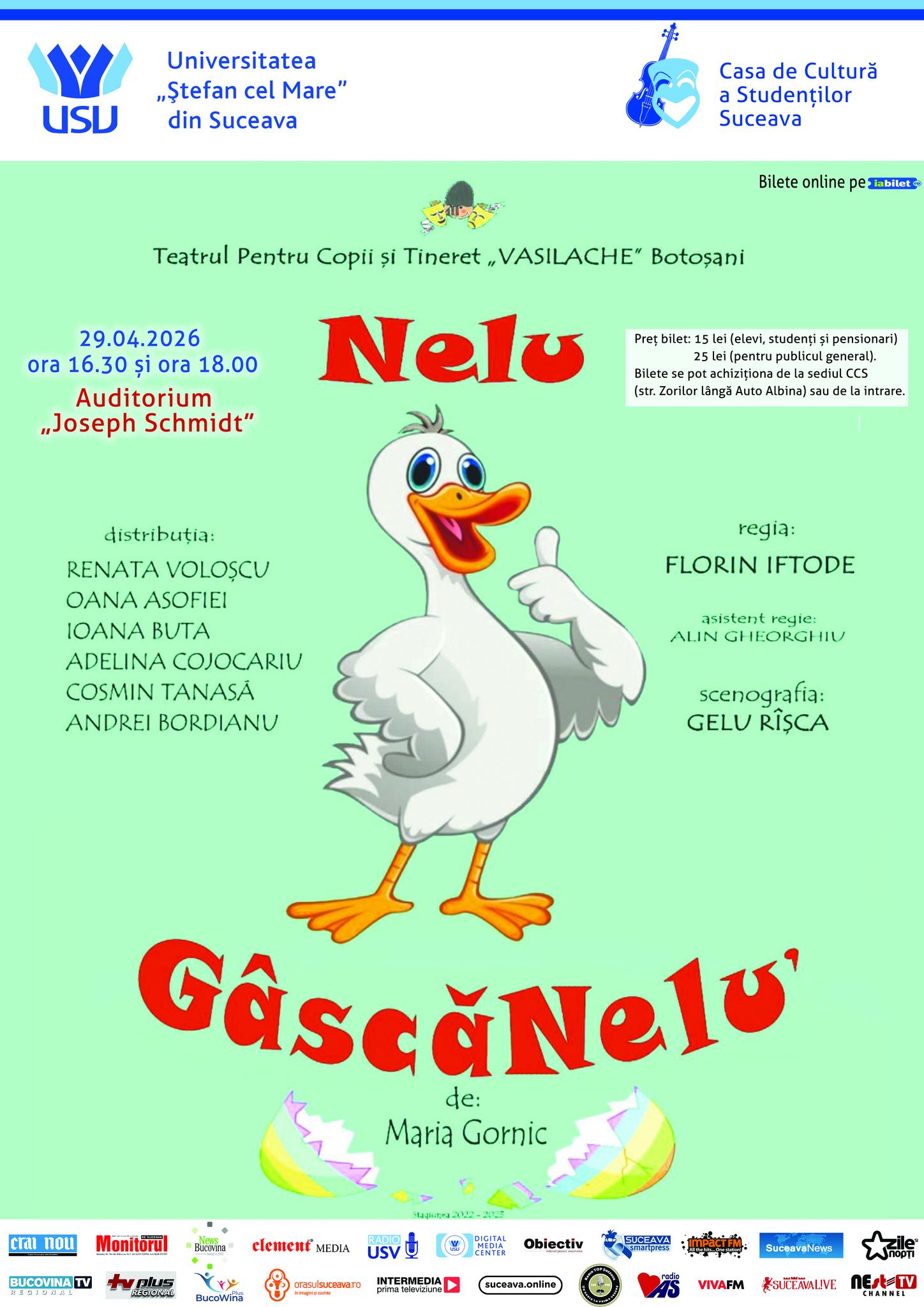 Casa de Cultură a Studenților din cadrul Universității „Ștefan cel Mare” din Suceava invită părinții și copiii la spectacolul de teatru Nelu GâscăNelu’, o poveste plină de peripeții și învățăminte, care va avea două reprezentații, de la orele 16:30 și 18:00, pe scena Auditoriumului „Joseph Schmidt”.