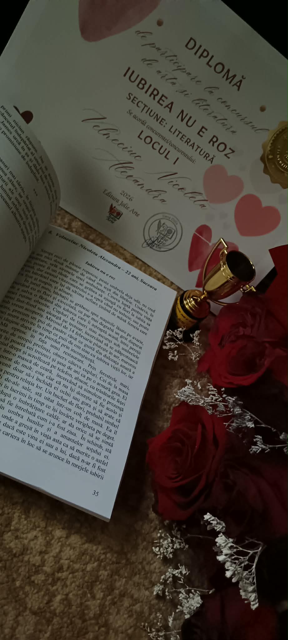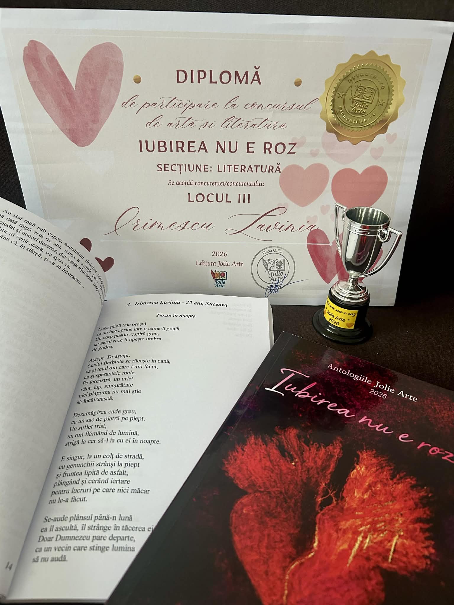 Între 14 ianuarie şi 28 februarie a.c., s-a desfăşurat Concursul de Artă şi Literatură „Iubirea nu e roz”, organizat, la București, de către SC JOLIE ARTE SRL, un concurs derulat pe două secţiuni, artă vizuală și creație literară, conceput în scop cultural-artistic. Concursul a fost deschis cetăţenilor din România, Republica Moldova și diaspora, invitând la o reflecție artistică și/sau literară asupra iubirii reale, imperfecte, intense, contradictorii, dureroase sau profunde prin înscrierea în concurs, în cadrul secţiunii de creaţie literară, a maximum trei pagini de proză sau a trei poezii inedite pe tema precizată.