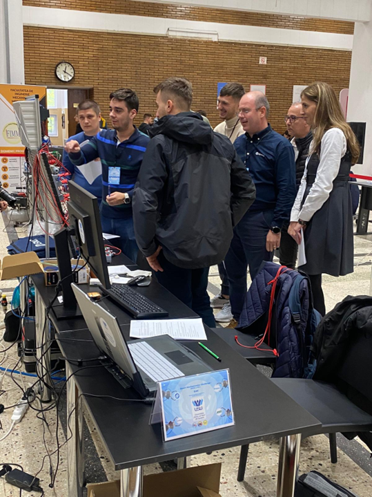 - Pentru prima probă, s-a utilizat o platformă educațională (ADVANCED E-PNEUMATIC SMC TRAINING SYSTEM) destinată instruirii în domeniul automatizărilor industriale. Sistemul include elemente pneumatice și electro-pneumatice, precum cilindri pneumatici, senzori, distribuitoare pneumatice și un controler PLC Finder, permițând realizarea și testarea circuitelor pneumatice complexe. Datorită structurii modulare, aceasta oferă posibilitatea configurării și controlului proceselor pneumatice, facilitând învățarea practică a principiilor de comandă și execuție. În ziua concursului, studenții au avut la dispoziție 90 min pentru rezolvarea tuturor probelor.
