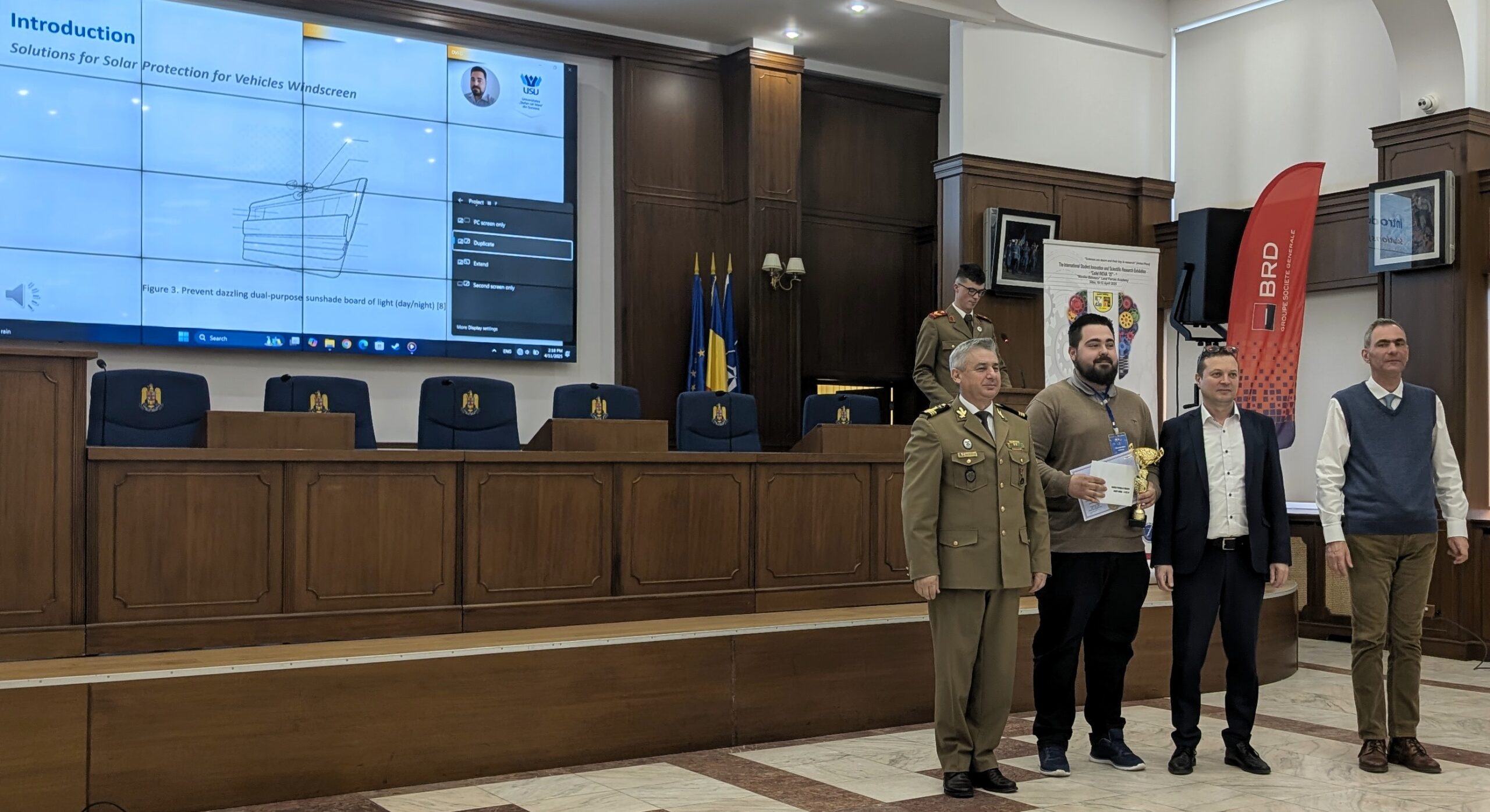 Astfel, Marele Premiu a fost câștigat de lucrarea Sistem de parasolare cu reglare dinamică pentru parbriz, autori: Alexandru LEONTE, Ciprian BEJENAR, Lucian VĂCARU, Laura-Cătălina DOSPINESCU, Constantin-Cornel TUDURIU. Sistemul parasolar cu reglare dinamică își propune să îmbunătățească confortul conducătorului vehiculului auto, feroviar, al echipamentelor de zbor sau al navelor maritime, în cazul fenomenului de orbire solară sau provenit de la alte surse puternice de lumină. Sistemul modifică în trepte, automat și rapid, gradul de transparență al geamului în zona de unde provine sursa de lumină. Proiectul se alătură altor teme similare din domeniul ingineriei autovehiculelor aflate în studiu în cadrul Facultății de Inginerie Electrica și Știința Calculatoarelor din Suceava.