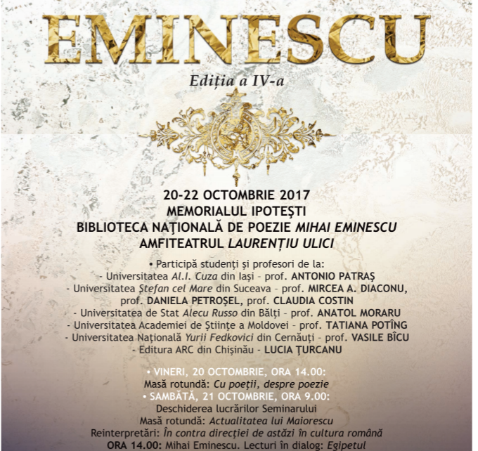 Studenți ai Facultăţii de Litere şi Ştiinţe ale Comunicării participă în perioada 20 – 22 octombrie 2017, la a IV-a ediție a Seminarului „Mihai Eminescu”, organizată de Memorialul Ipoteşti – Centrul Naţional de Studii „Mihai Eminescu”. Lucrările seminarului vor începe, în data de 20 octombrie, ora 15.30, cu lecturile publice ale poeţilor botoşăneni Gellu Dorian,