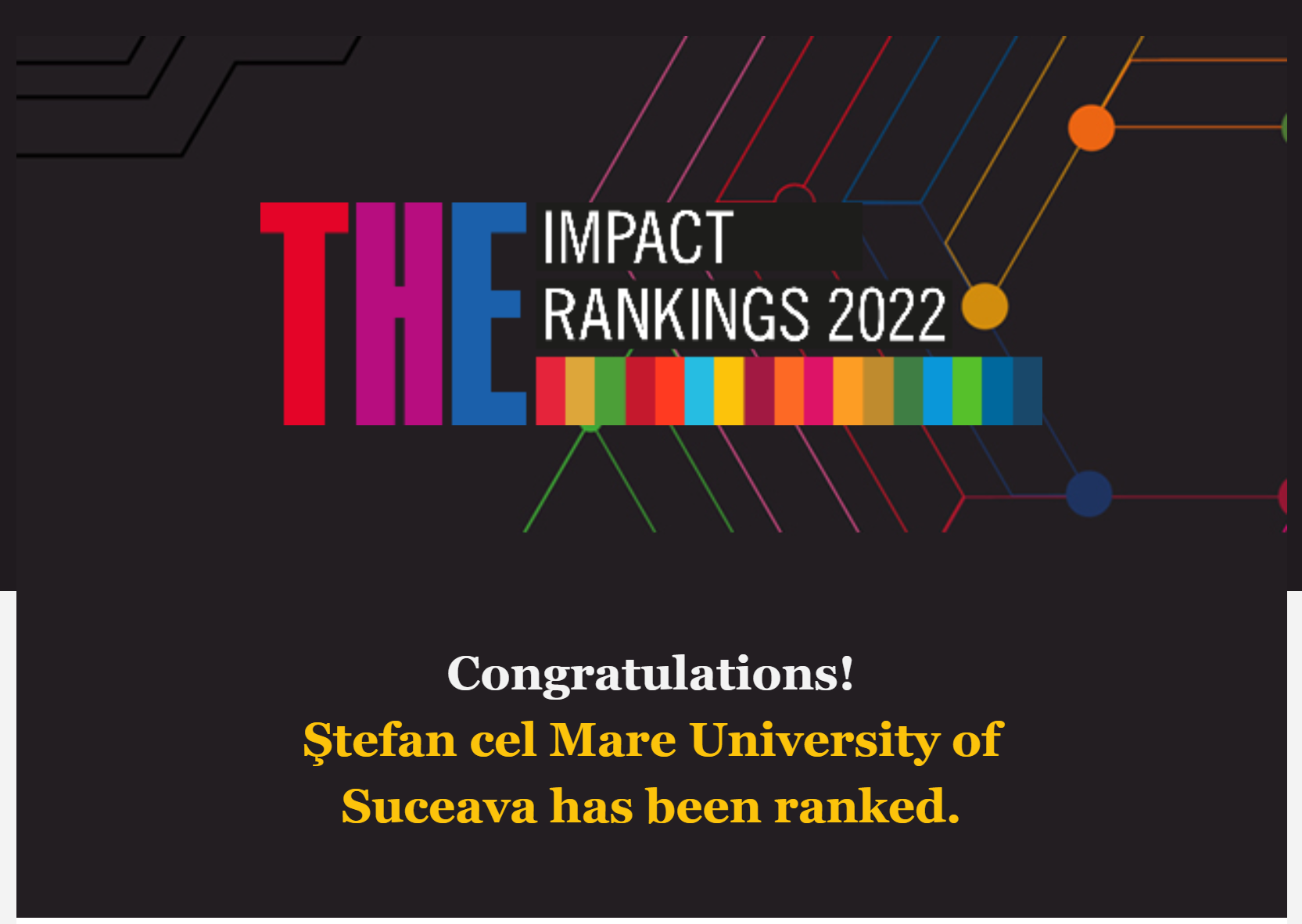 Astfel, constatăm cu satisfacție că, grație eforturilor susținute ale întregii comunități academice, USV este pentru prima data indexată în THE Impact Rankings și face parte dintre primele 1406 universități ale lumii din perspectiva impactului pe care îl are asupra societății contemporane.