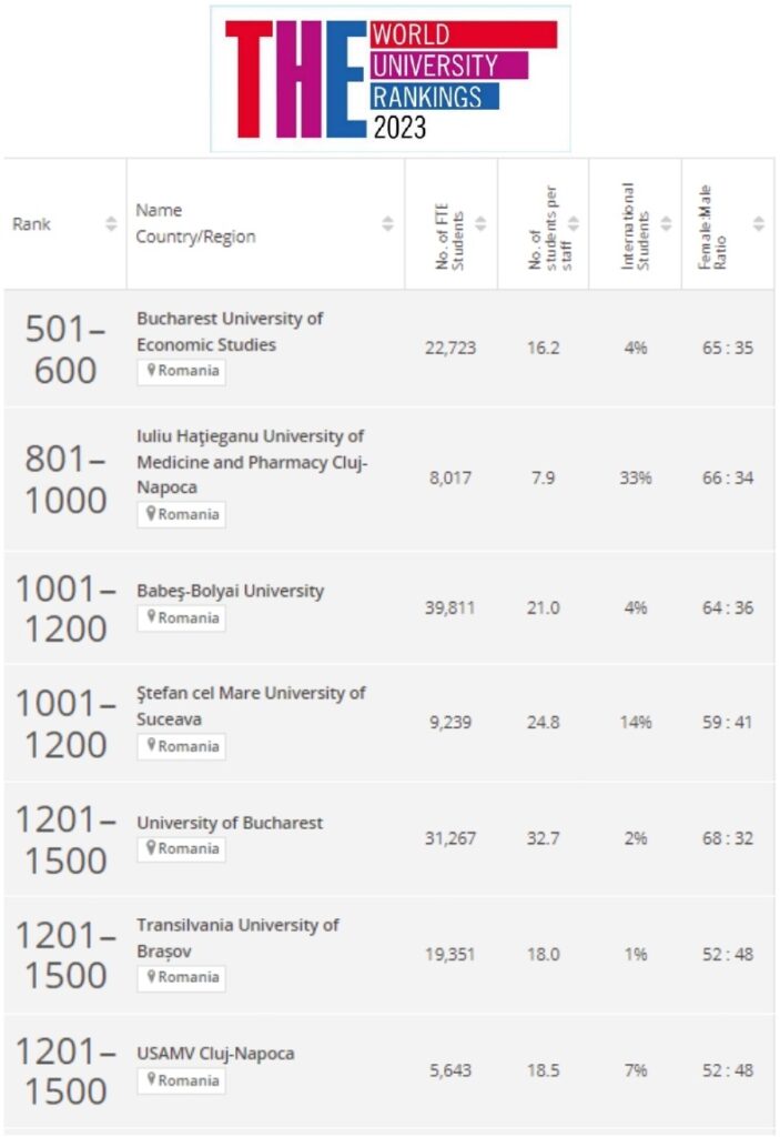 Debutul noului an universitar marchează un moment important în parcursul Universității „Ștefan cel Mare” din Suceava, care a fost inclusă, în premieră, în Clasamentul Internațional al Universităților Times Higher Education (Times Higher Education World University Rankings), consolidând, astfel, prezența constantă pe care instituția de învățământ superior suceveană a avut-o în ultimii ani în cele mai titrate ierarhizări realizate la nivel mondial. În ediția 2023 a THE WUR, universitatea suceveană se situează în intervalul 1001-1200, dintr-un total de 1799 de universități din 104 țări și regiuni, și pe locul al 3-lea la nivel național, alături de Universitatea „Babeș-Bolyai” din Cluj-Napoca. Între cele 20 de universități din România incluse în noua ediție a clasamentului, USV se află după Academia de Studii Economice din București și Universitatea de Medicină și Farmacie „Iuliu Hațieganu” din Cluj-Napoca, fiind urmată de Universitatea din București, Universitatea „Transilvania” din Brașov, Universitatea de Științe Agricole și Medicină Veterinară din Cluj-Napoca.