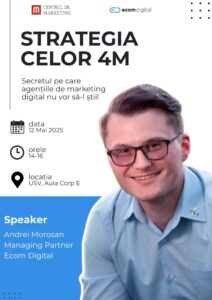 Pe 12 mai, de la ora 14:00, în Aula Corp E a Universității „Ștefan cel Mare” din Suceava, ai ocazia să participi la un eveniment care îți poate schimba modul în care privești promovarea online: workshop-ul „Strategia celor 4M — un cadru practic și eficient pentru creșterea digitală”.